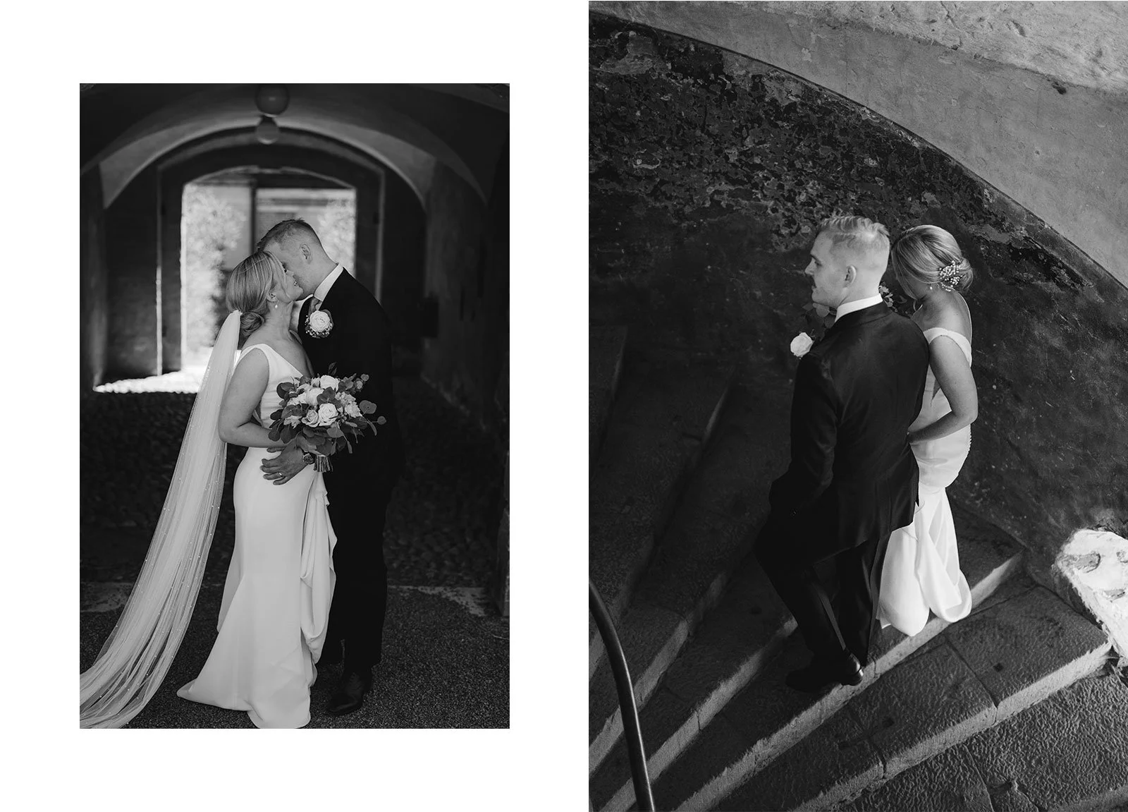 Vihkiminen järjestettiin Suomenlinnan Pirunkirkossa, ja juhlia vietettiin sen viereisessä juhlasalissa. Suomenlinna ei kyllä pettänyt taaskaan ja tuulinen sää kruunasi vielä huntukuvat. Loputtomasti upeita taustoja ja hienoja kujia, joihin kaunista pari asetella. Harvoin Suokissa malttaa sessiota ajoissa lopettaa, aina löytyy lisää ja lisää kuvattavaa.